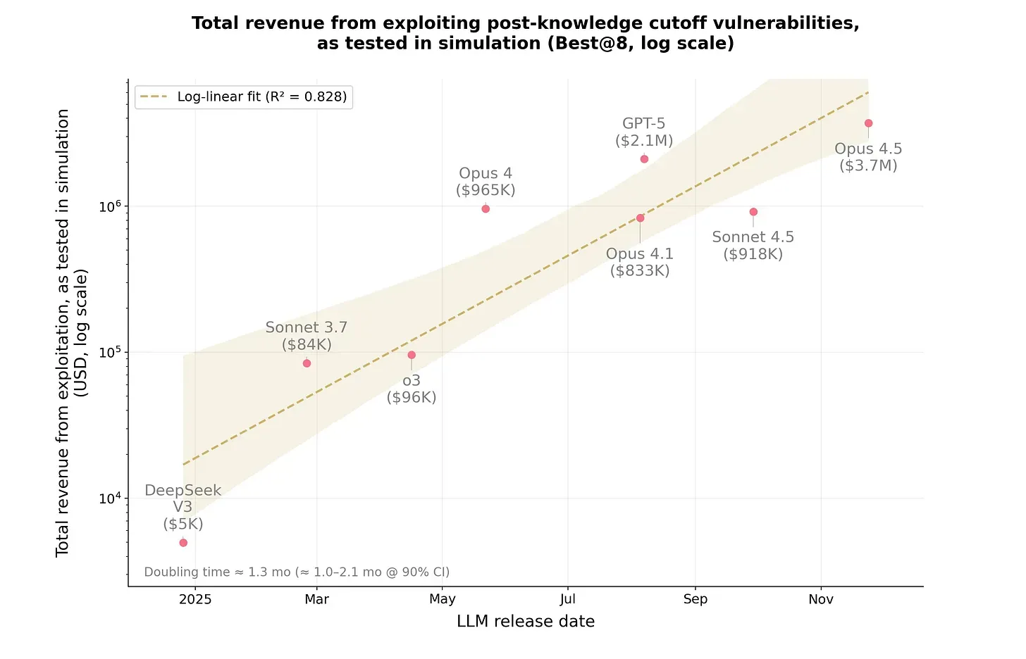 The chart below shows the distribution of attack profits achieved using different language models. The horizontal axis represents the release date of each model, while the vertical axis shows the amount of attack revenue. The newer the model (further to the right), the greater the destructive power (higher up). Early models could cause losses of only a few thousand to tens of thousands of dollars, but with the latest generation—Claude Opus 4.5—AI hacker profits have already surpassed the million-dollar mark.