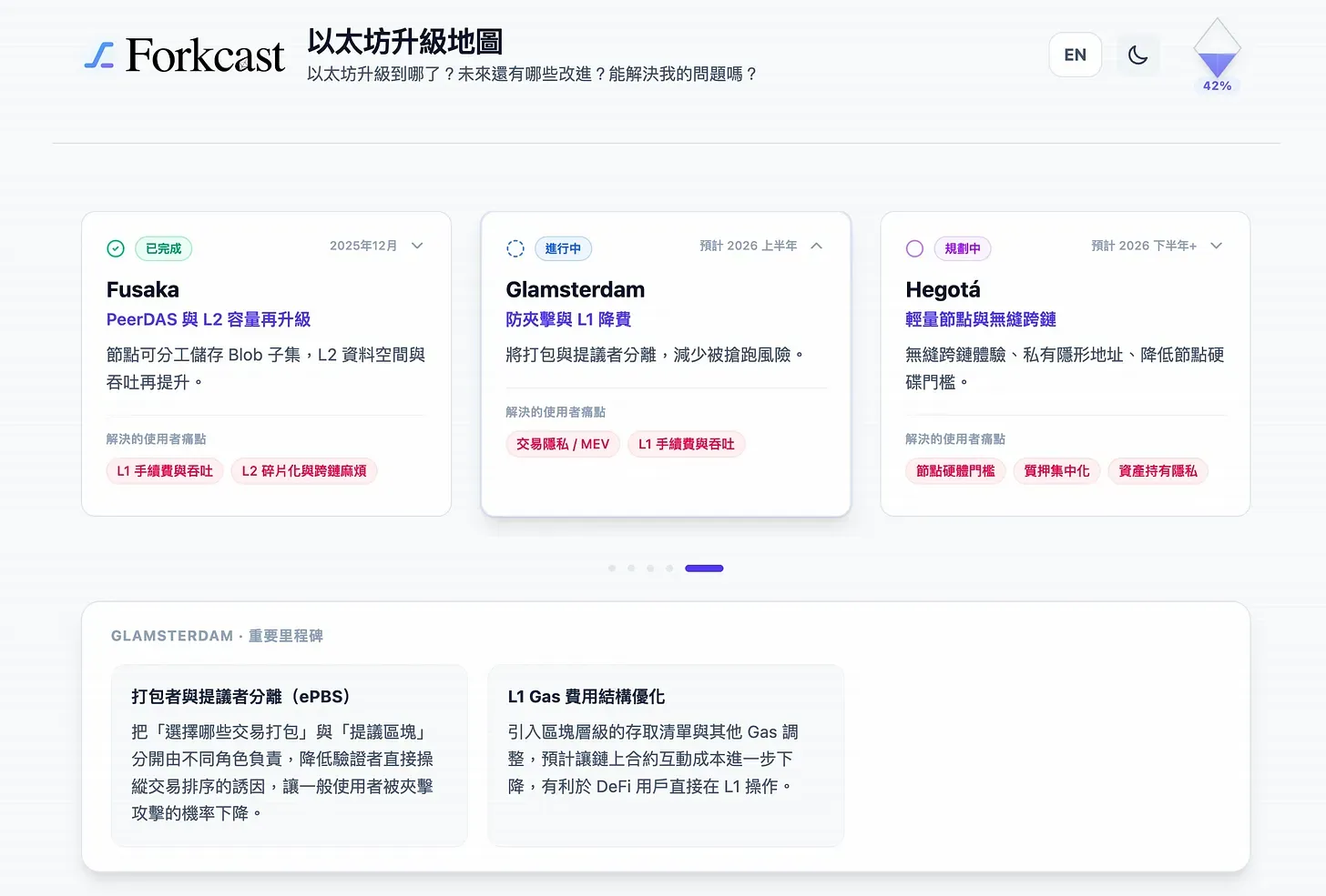 The website’s visual design is quite modern. However, Forkcast ultimately serves technical developers, so for general readers, the barrier to entry is still relatively high. The “Ethereum Upgrade Map” I created is built on top of Forkcast, but redesigned with more accessible content and presented primarily in Traditional Chinese.