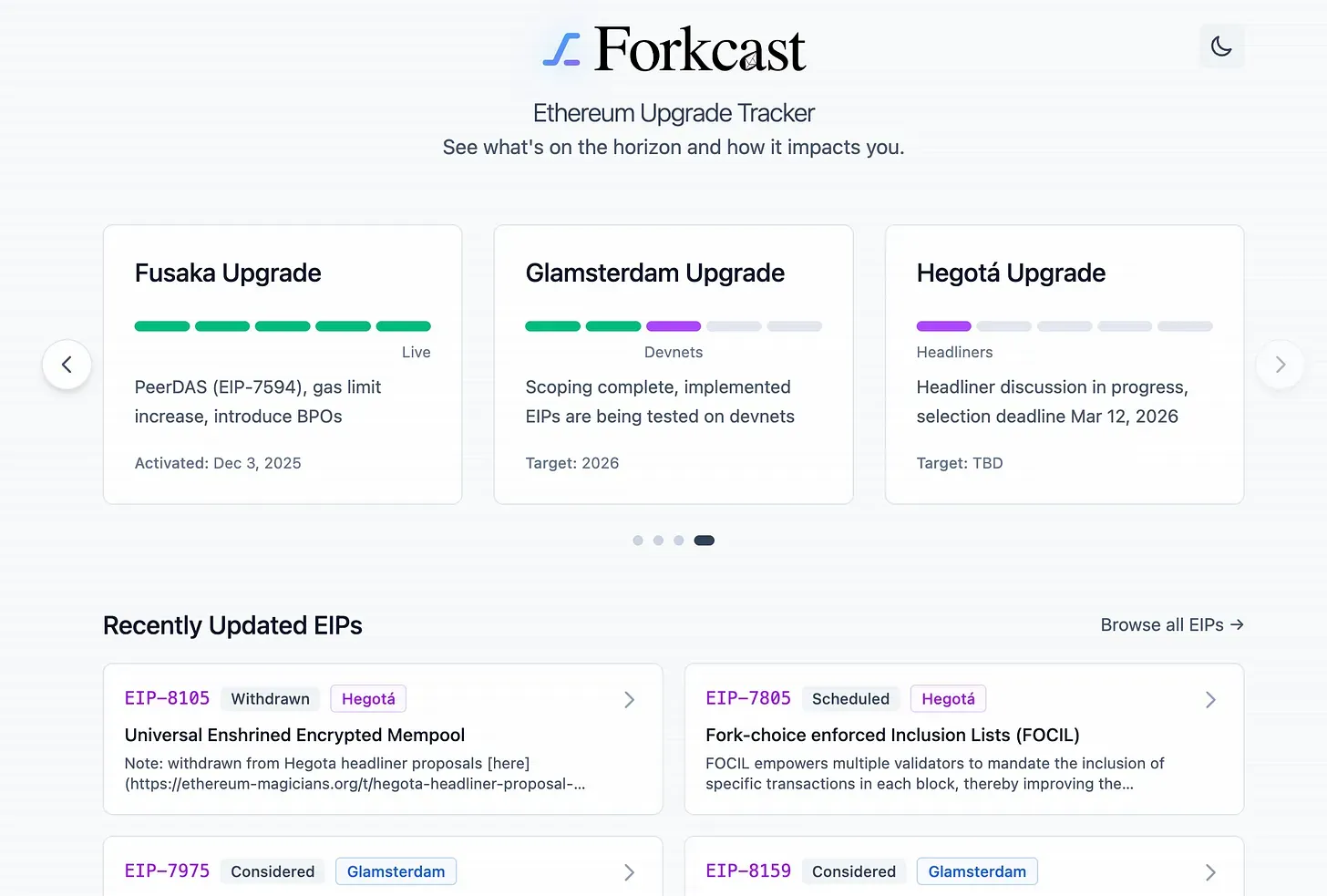 That changed in 2025, when the Protocol Support team at the Ethereum Foundation, which coordinates technical development, launched a website called Forkcast. Its goal is to reorganize abstract technical roadmaps and translate them into a more intuitive upgrade progress tracker. According to their introduction to Forkcast: