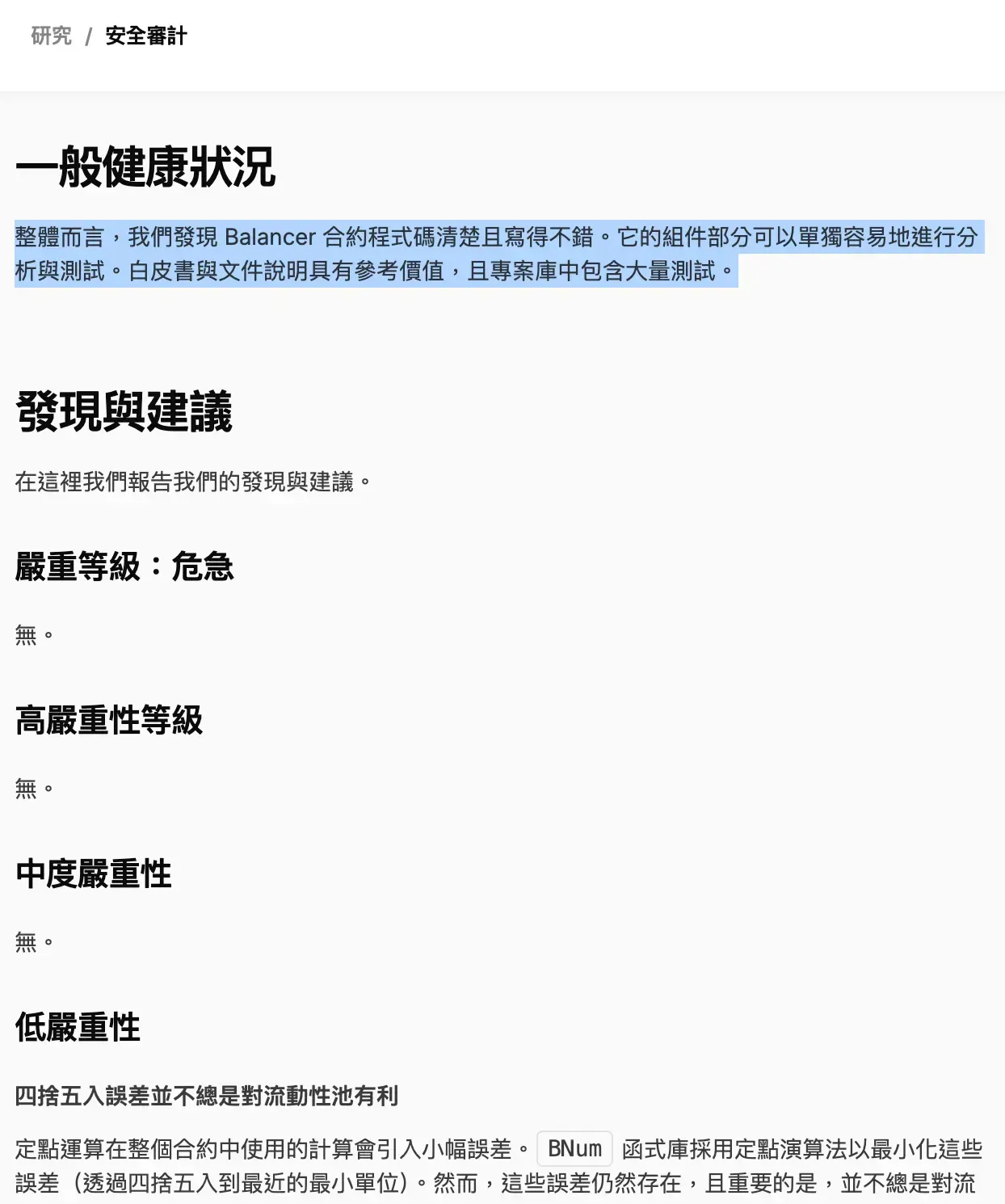 Ultimately, OpenZeppelin gave Balancer’s contracts an overall evaluation of “well-written and clear”, with the rounding error categorized as a “low-severity issue.”
