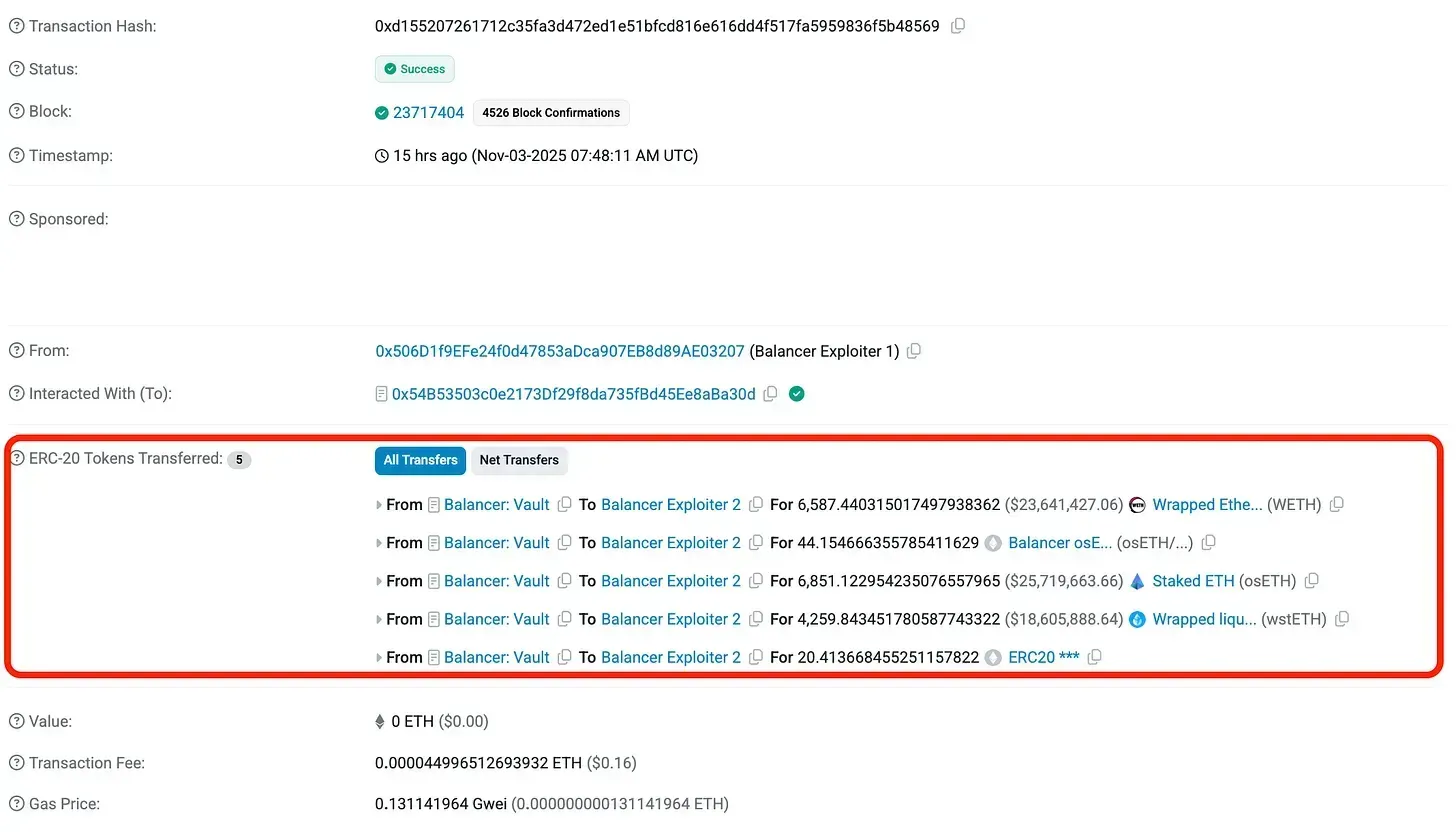 The image below shows the on-chain transaction records from November 3, when the attack occurred. In a single transaction, the hacker executed multiple smart contract operations, draining Balancer’s liquidity pools in one swoop and stealing approximately $130 million in total.