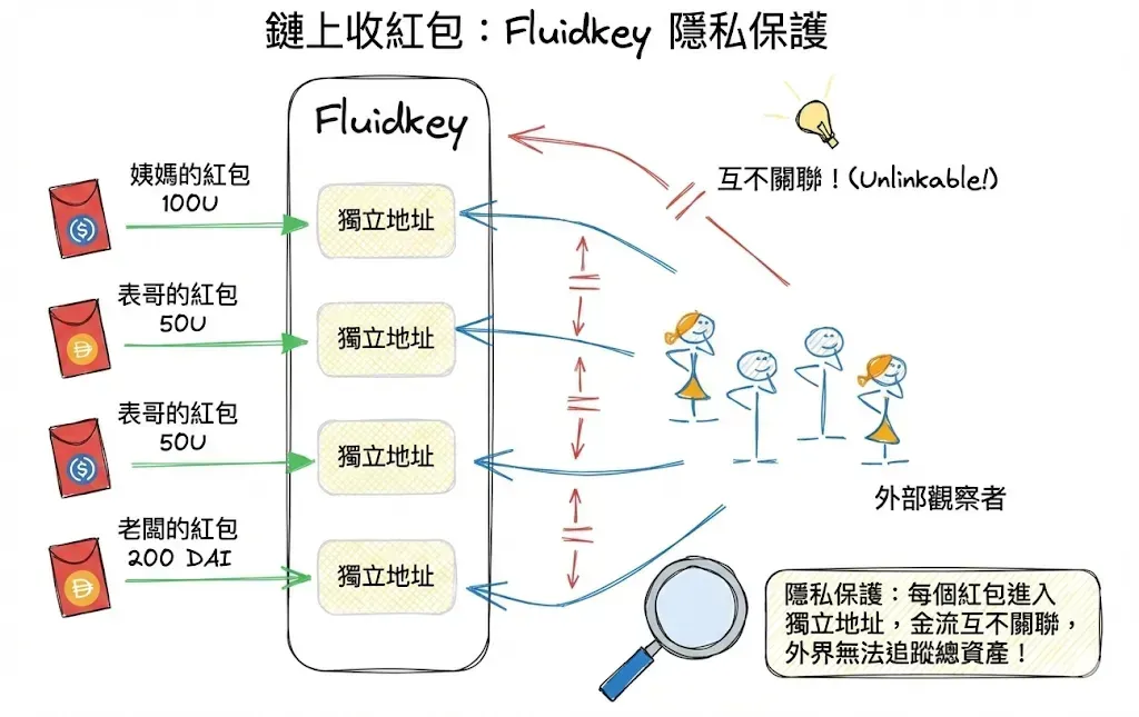 A stealth address is like placing each sum of money into a different pocket, each kept independently; only the user knows the total balance of all these pockets combined. The biggest difference between this and a crypto mixer is that the funds are not mingled with other people's transactions, thereby eliminating money laundering concerns. Every time a user claims a red envelope, Fluidkey automatically generates a new "pocket" to store it separately, balancing both privacy and compliance.