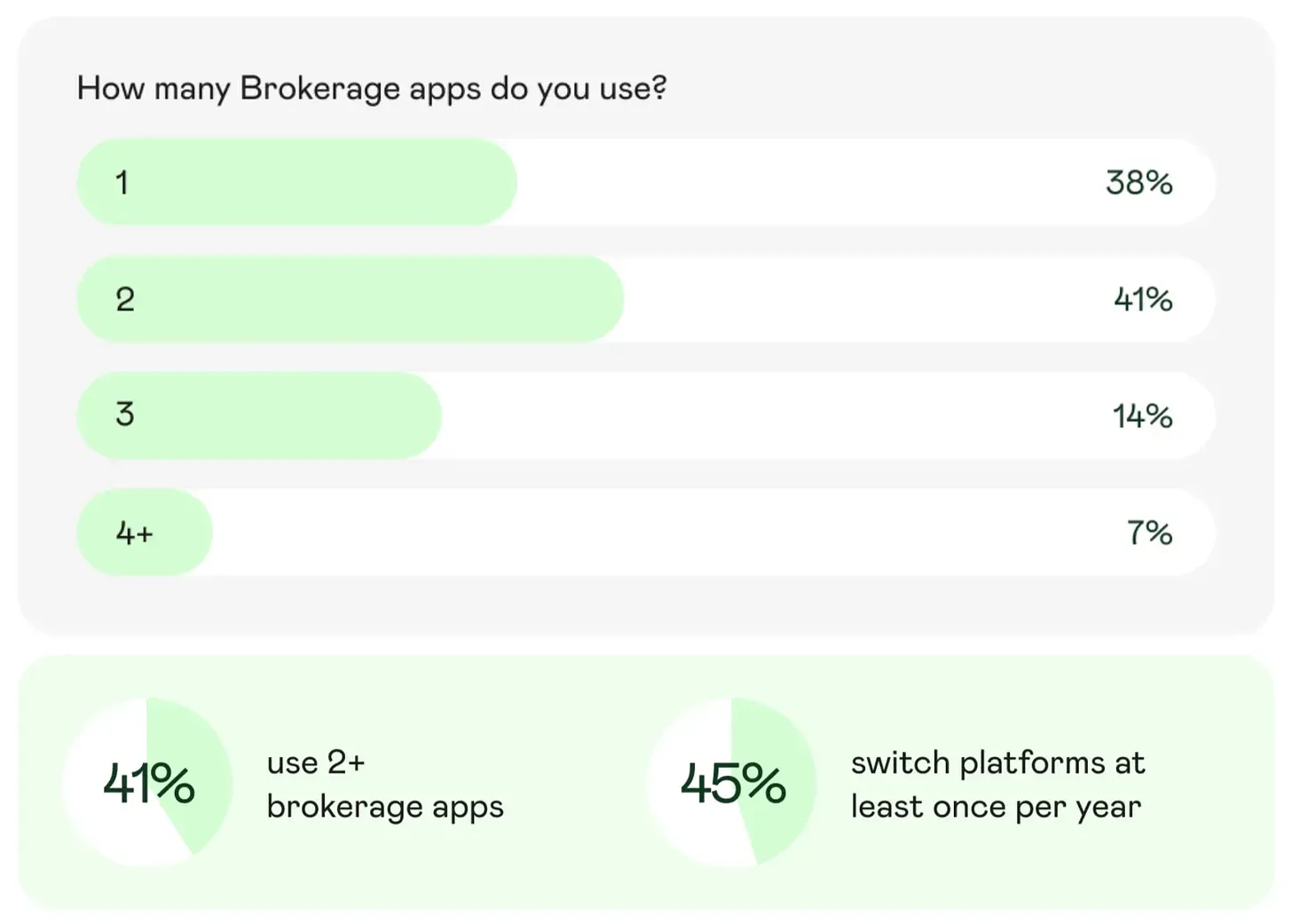 As a result, many people went on to open additional accounts with Schwab or Interactive Brokers, and some even decided to switch brokers entirely. I initially thought this would remain a niche choice, but another survey suggests that competition among brokerages is far more intense than expected. After surveying 2,000 overseas brokerage users worldwide, the report found that as many as 62% use more than one brokerage app, and 45% switch to a different broker every year.