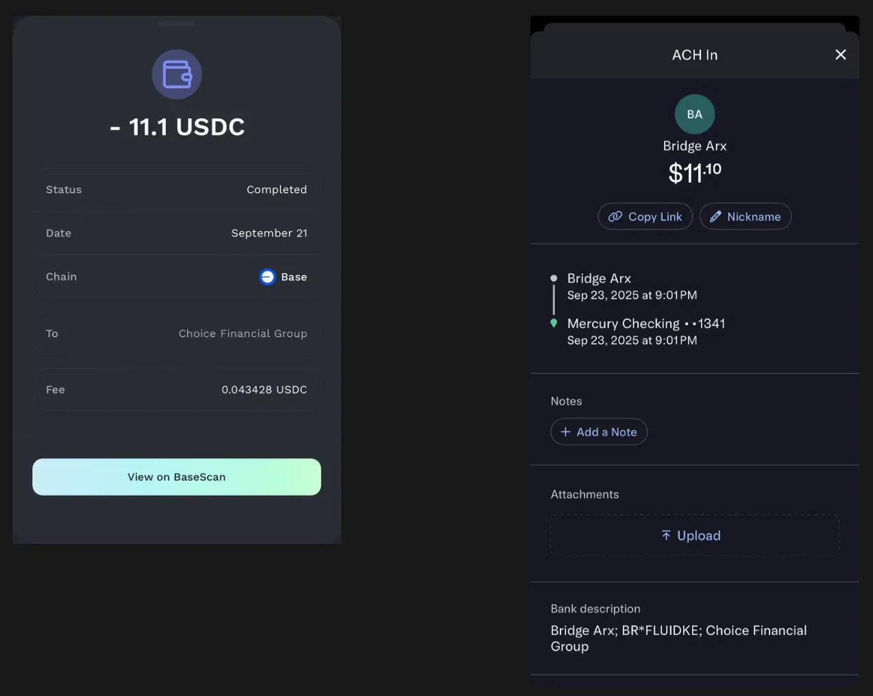 I’ve personally tried it several times, off-ramping stablecoins and ETH from my wallet to a U.S. bank. The whole process is exactly the same as a regular on-chain transfer, except the recipient field is no longer a 0x address but a bank account number. Each transaction still comes with an on-chain transaction ID (txid), and the fees are just as cheap.