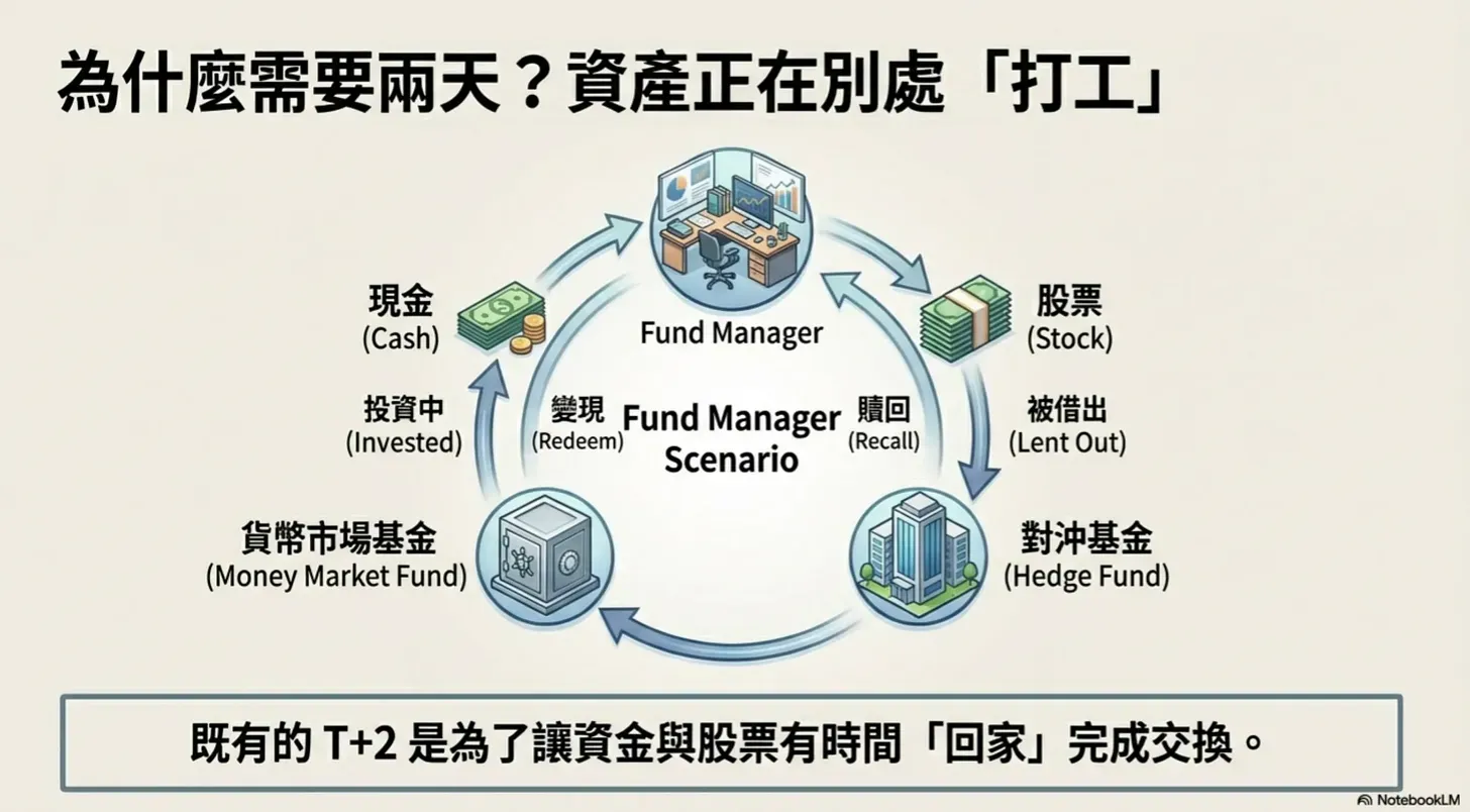 On the other side, the pension fund manager is pleased to hear that your shares aren’t immediately available—because their cash has also been parked in low-risk money market funds earning yield, and they need time to redeem it. In the end, both parties agree to complete the exchange two days later. That’s what T+2 settlement looks like.